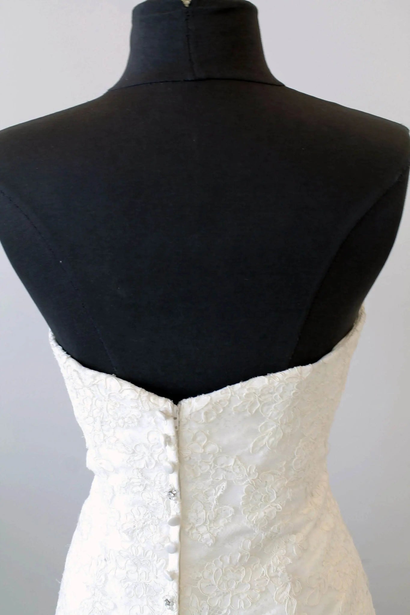 The strapless sweetheart neckline creates a timeless, romantic silhouette that beautifully frames your upper body. Crafted with intricate lace detailing throughout, this dress combines classic elegance with modern sophistication. The fitted bodice gracefully flows into a flared skirt, creating that coveted A-line silhouette that accentuates your curves. The chapel-length train adds dramatic flair and features delicate lace appliques that cascade to the floor. The back of the gown showcases a row of classic buttons, adding a touch of traditional charm while ensuring a secure and flattering fit. The pristine white color symbolizes tradition and purity, while the layered lace adds depth and dimension to the overall design. This gown strikes the perfect balance between classic bridal elegance and contemporary style, making it an ideal choice for brides seeking a dress that's both sophisticated and memorable. The quality construction and attention to detail ensure you'll feel as beautiful as you look while walking down the aisle.